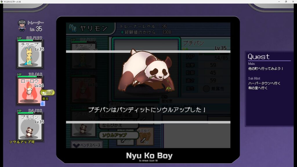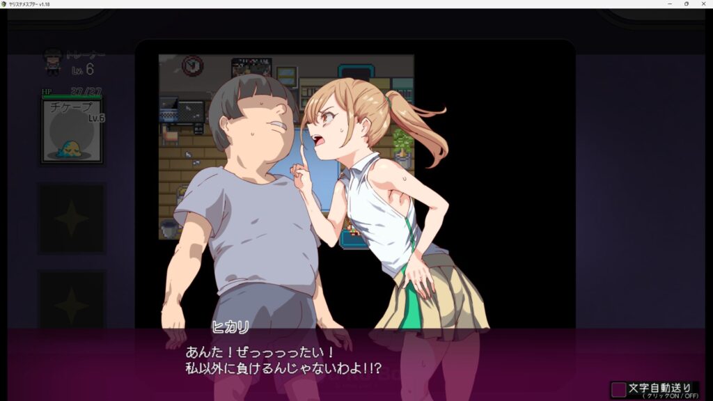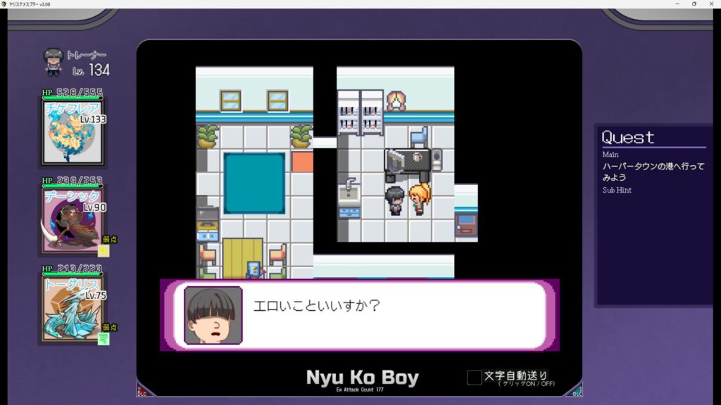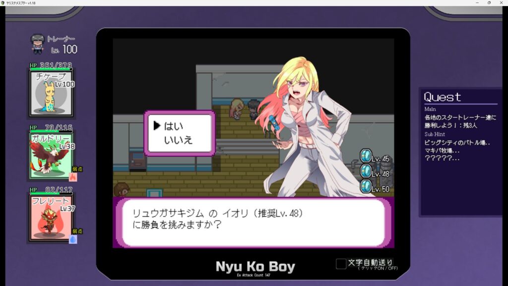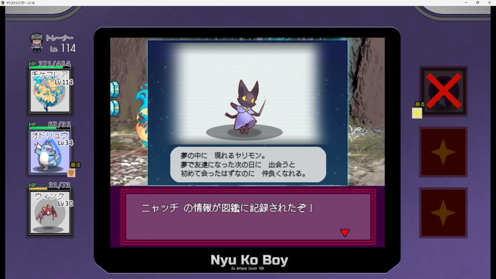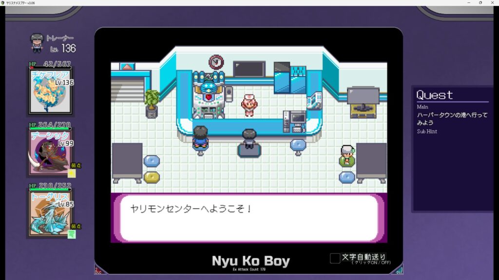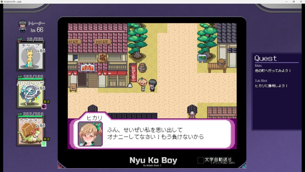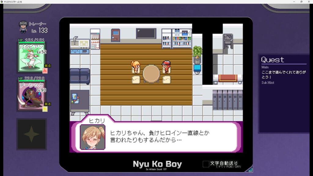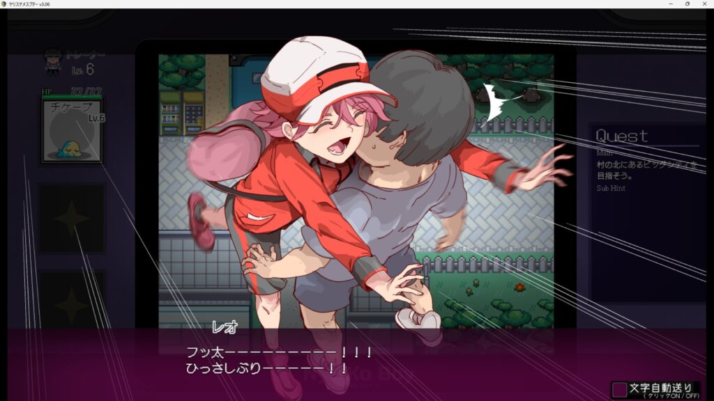 ストーリー進行のヒント、イベントシーンを観るためのヒント、ヤリモン図鑑を埋めるためのヒント(野生ヤリモンの出現場所情報)が備わっているので、Webの攻略を一切見なくても少し頭を捻ればゲーム内情報だけで全要素コンプリートが可能です。達成状況が確認できるのでお漏らしもありません。