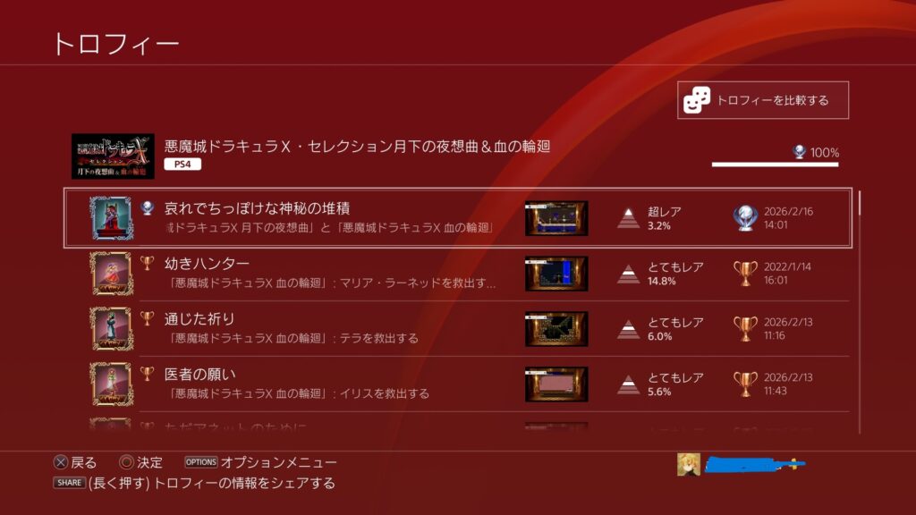 「血の輪廻」と「月下の夜想曲」とそれぞれにトロフィーが設定されており、両方コンプリートするとプラチナトロフィーが一つ手に入ります。