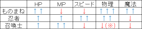 MPを上げたければ忍者か召喚士、スピードを上げたければ忍者、物理攻撃力を上げたければものまね士か忍者、魔法攻撃力が上げたければものまね士にします。HPはどのジョブでも上がります。