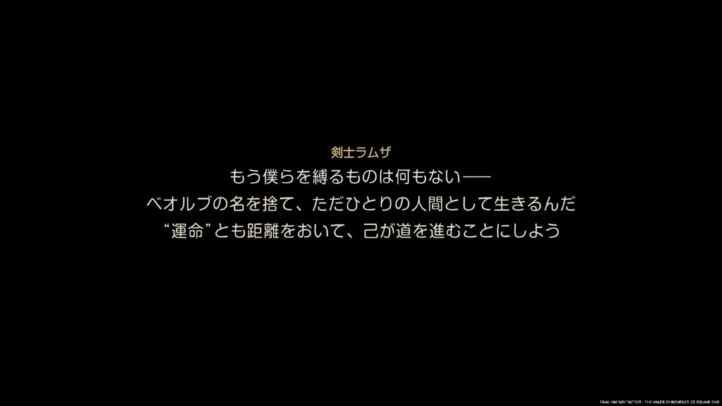 剣士ラムザ「もう僕らを縛るものは何もない──ベオルブの名を捨て、ただひとりの人間として生きるんだ ”運命”とも距離をおいて、己が道を進むことにしよう」