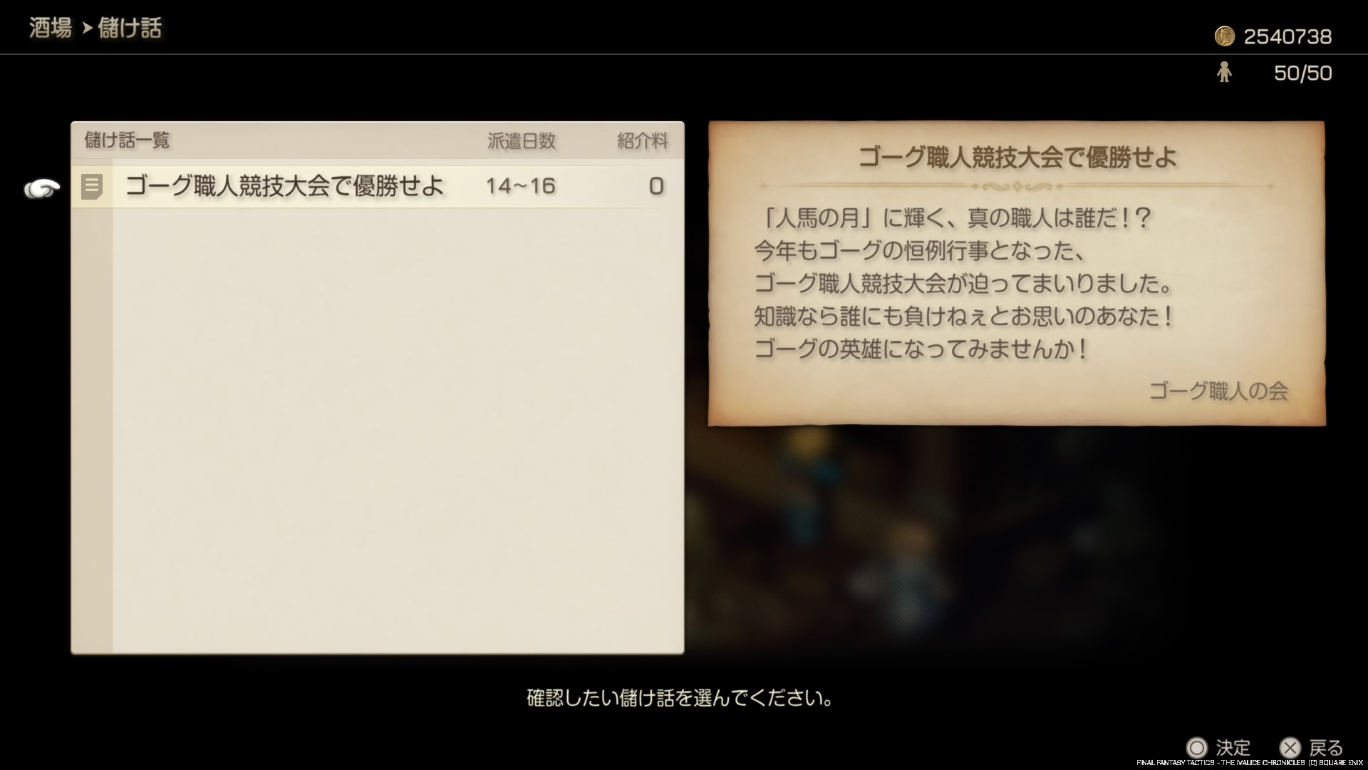原作と仕様は一緒ですが、イヴァリースクロニクルズでは儲け話コンプリートがトロフィーに設定されているので、儲け話にまつわるエトセトラについて触れておきたいと思います。