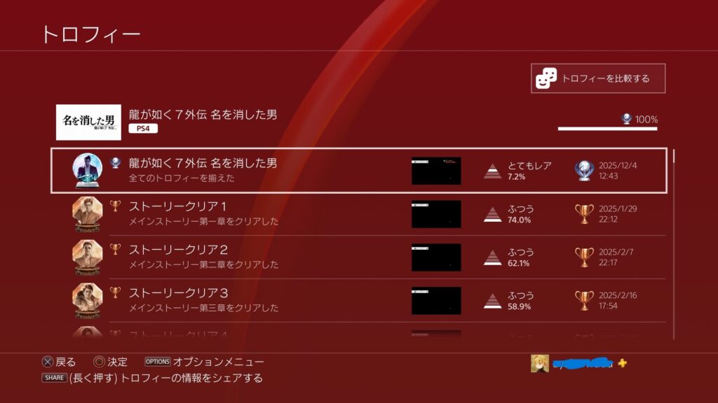 プレイヤー全体のトロコン率は7.2%。