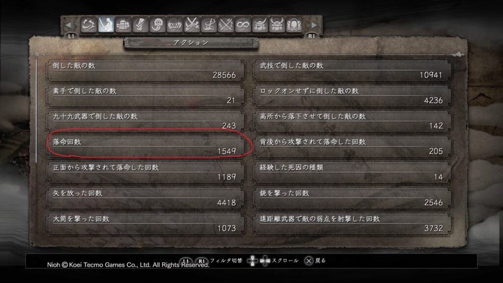 ちなみに私の場合は死亡(落命)回数1,549回ですって。もっと死んでるかと思った。