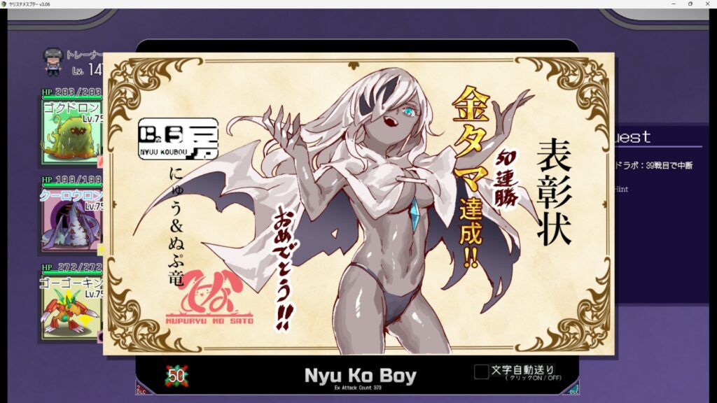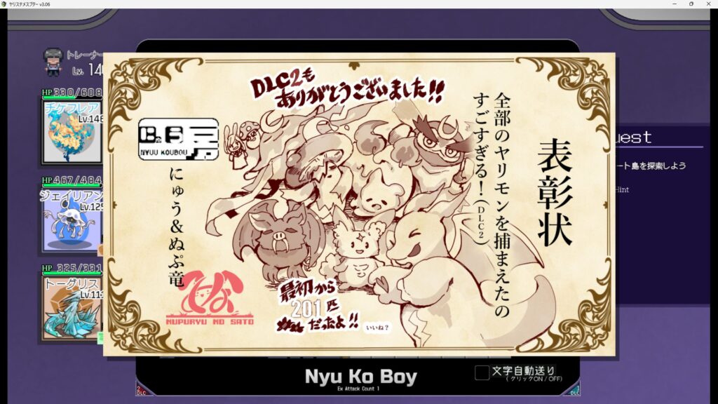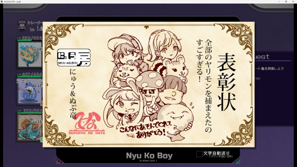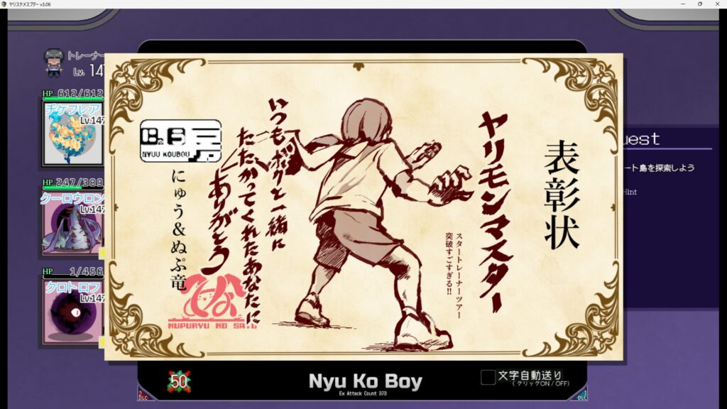 - 50戦クリア時に手持ちヤリモンが貰える