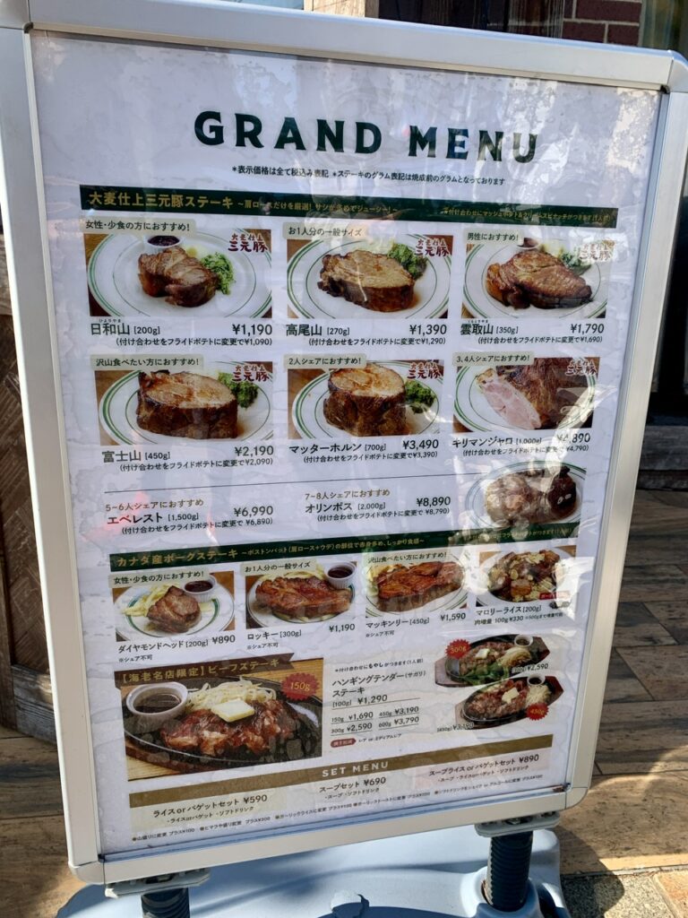 大麦仕上三元豚ステーキ、カナダ産ポークステーキ、ビーフステーキ(海老名店限定)の3種類があり、それぞれにサイズ違いがあるというシンプルなメニュー構成です。