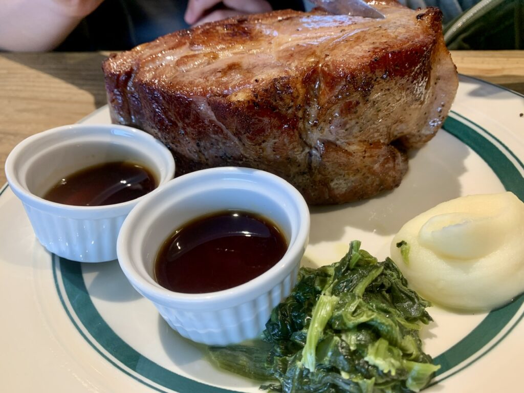 四日市のトンテキはニンニクがガッツリ効いた濃厚ソースと豚の甘みのマリアージュ、対してこちらのポークステーキは肉モロ出し!という感じ。