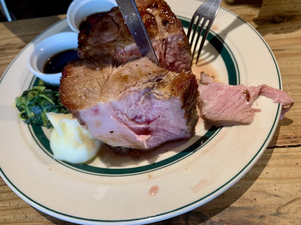 メニューの写真に偽りなし。まごうことなきマンガ肉。ド迫力です。あれ、でも骨が貫通していないとマンガ肉って言わないのか?